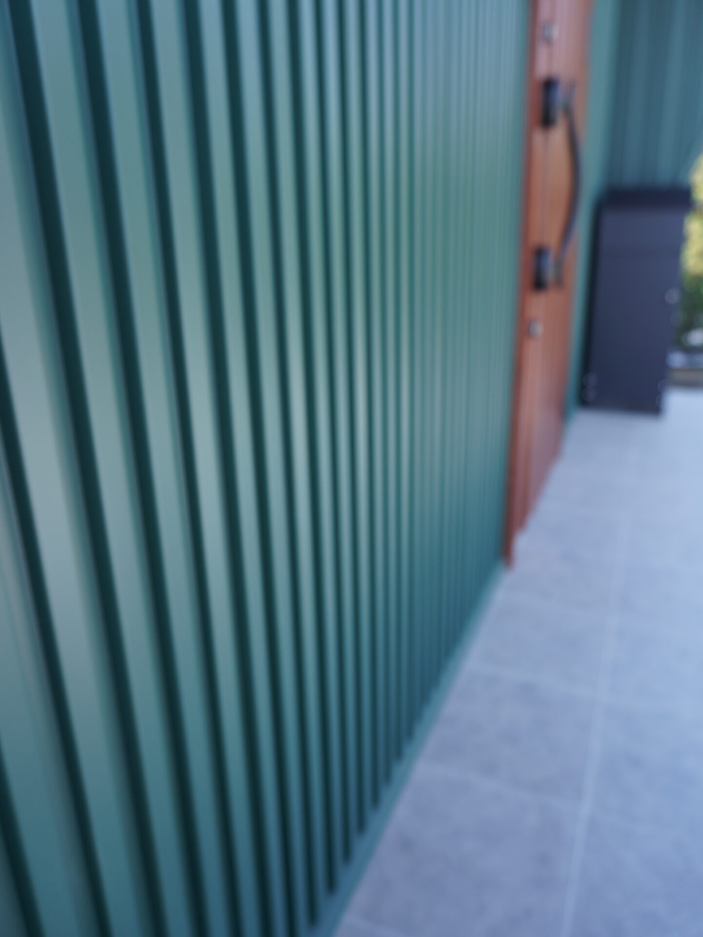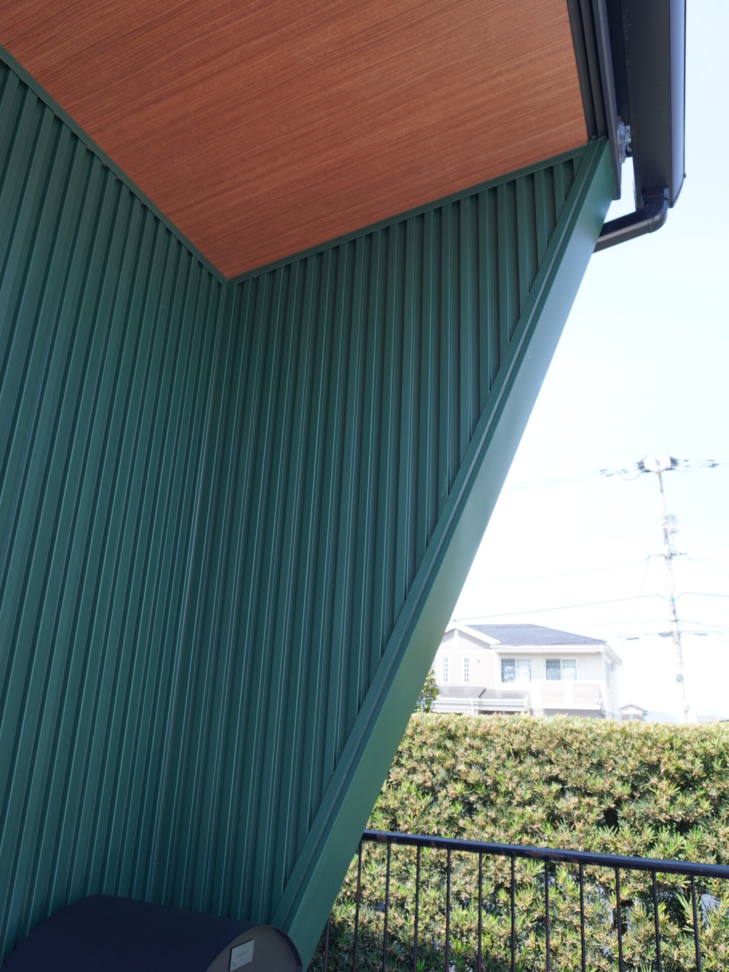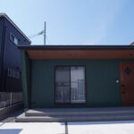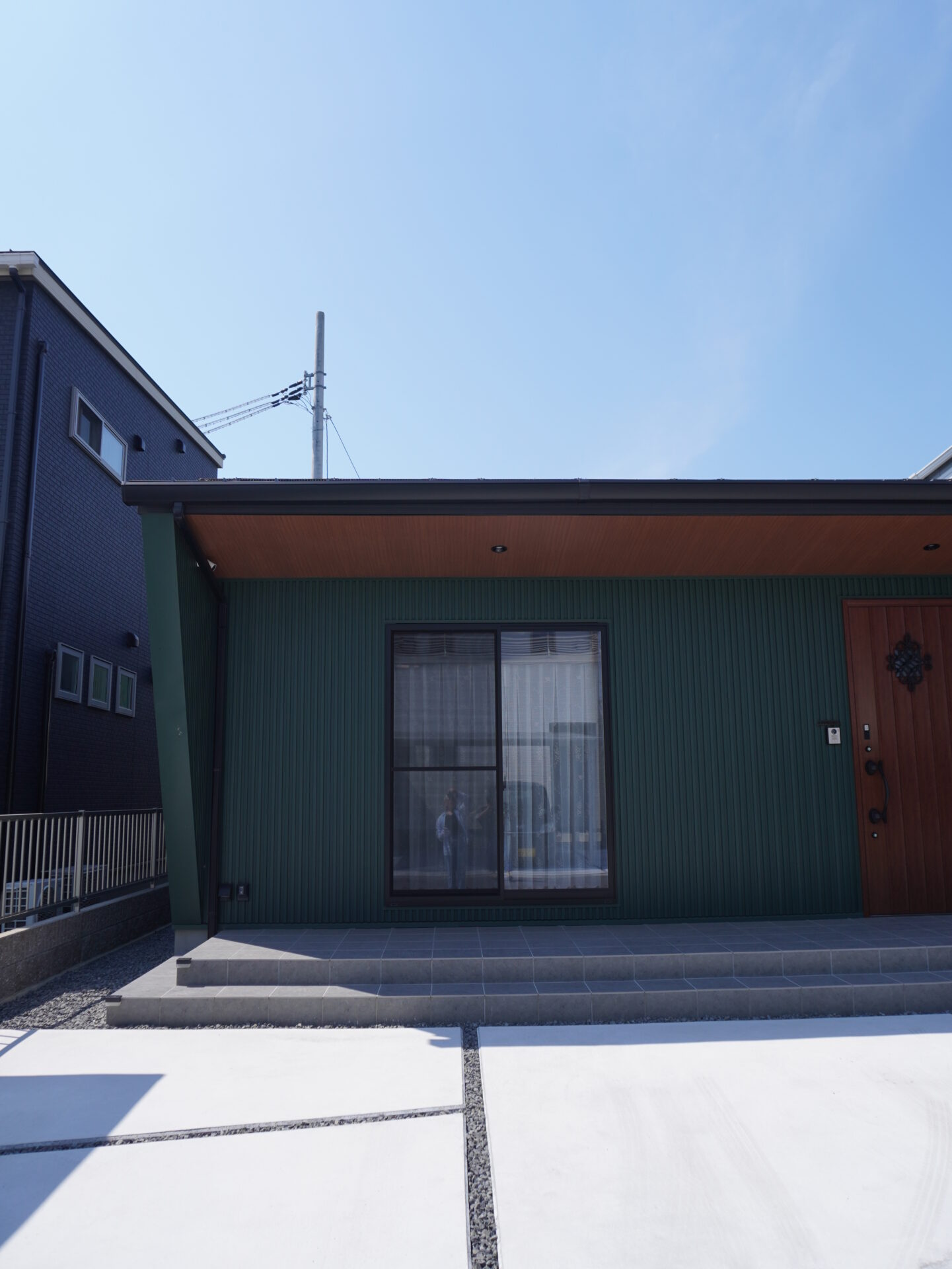 グリーンの外壁が目を引くスタイリッシュなデザインの平屋住宅です。